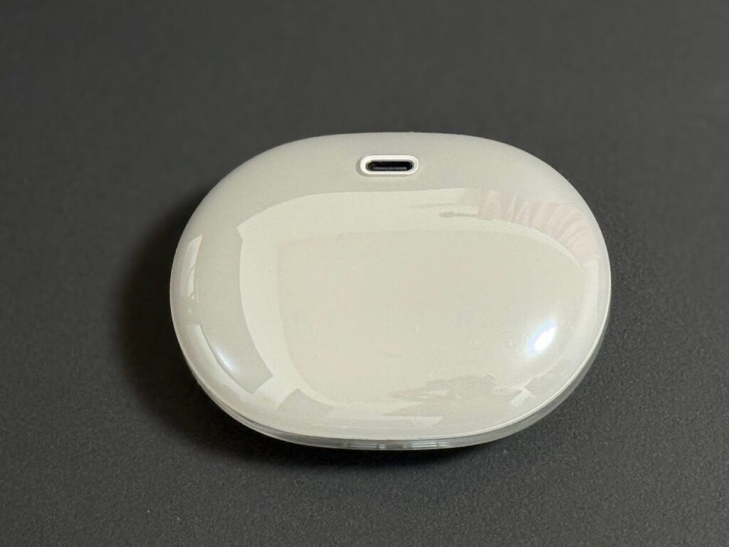 充電ケースは半透明のデザインで表面はツルツルしています。