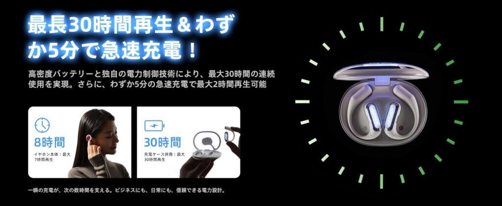 イヤホン単体で8時間、充電ケース併用で最大30時間の長時間再生が可能です。