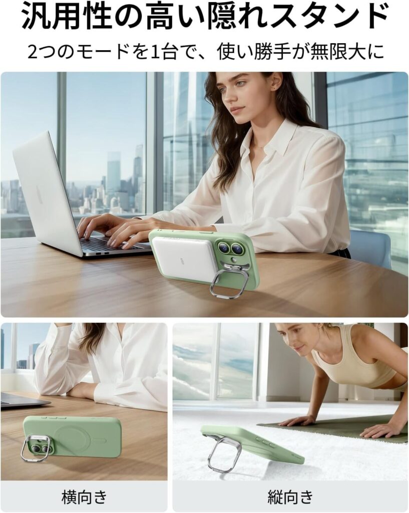 スマホケースにスタンドが内蔵されているので、別にスタンドを持ち歩く必要がなく、荷物を減らせるのもポイントです。