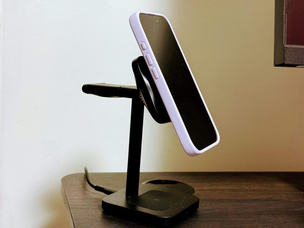 ESRのケースは磁力がしっかりしていて、同社の3in1充電器と組み合わせてもズレることはありませんでした。