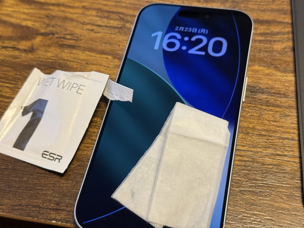 まずはiPhoneの表面を付属のアルコールパッドとクリーニングクロスで綺麗にします。