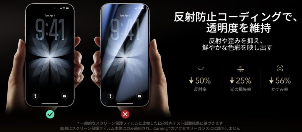 「ESR iPhone17/16 Pro ガラス保護フィルム」の特徴は以下のとおり。
