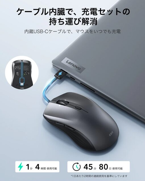 USB-Cケーブル内蔵なので、別途ケーブルを用意する必要がないのが嬉しいポイントです。