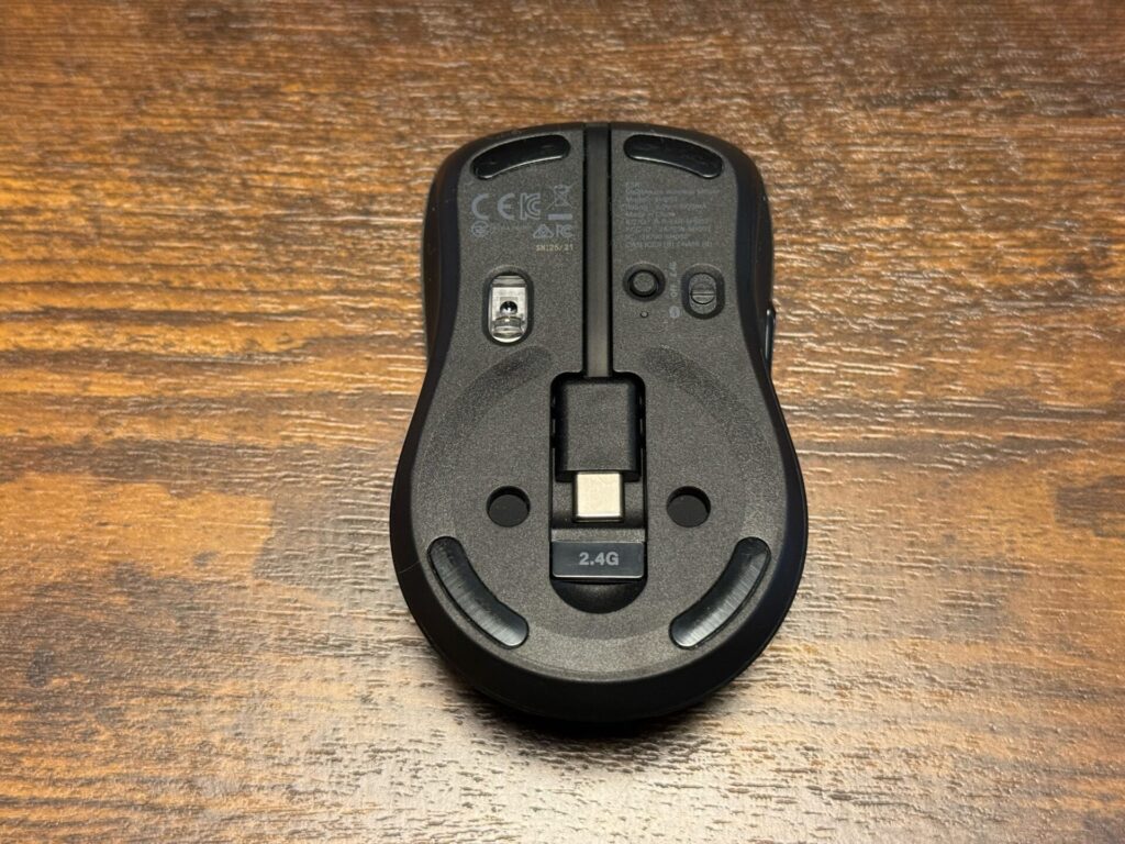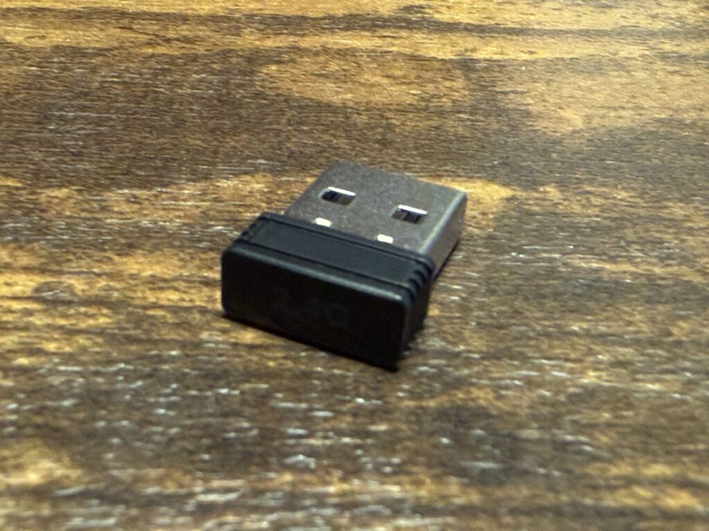 バッテリーは充電式で内蔵ケーブルを使って充電可能です。また2.4GHzで接続するためのUSBアダプタも付いています。