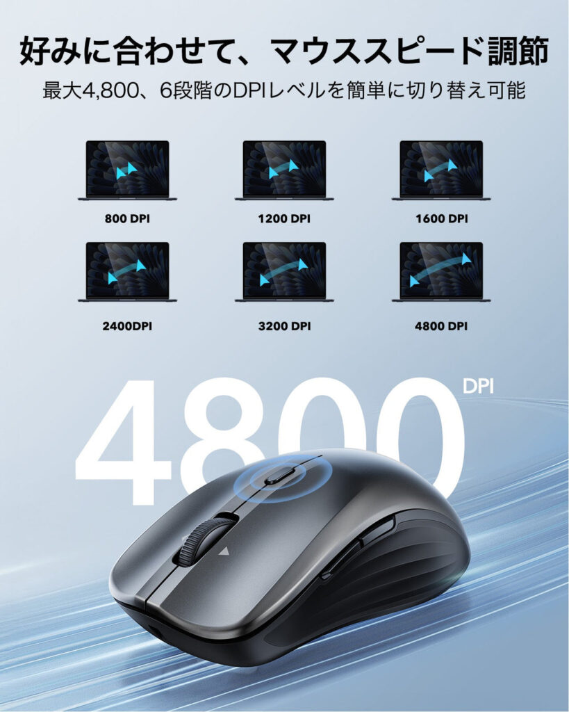 iPadのような小さい画面では低めのDPI、外部ディスプレイに接続している時は高めのDPI、といった使い分けができます。切替はマウス上部のボタンで簡単に行えます。