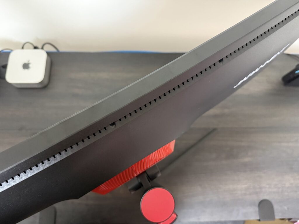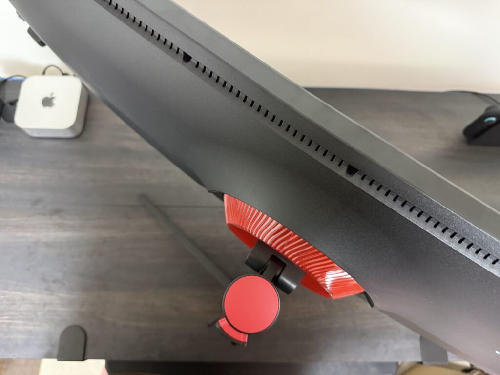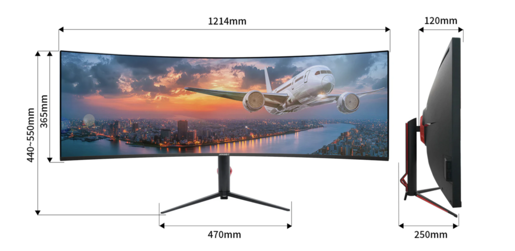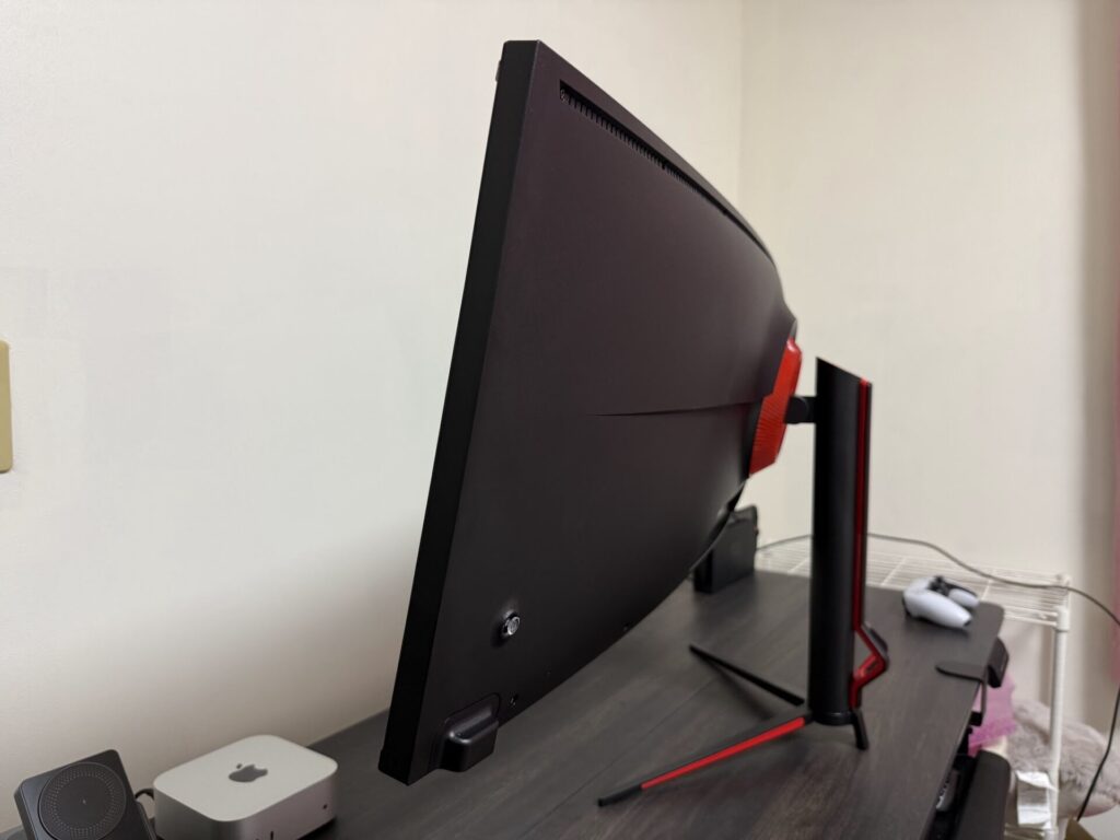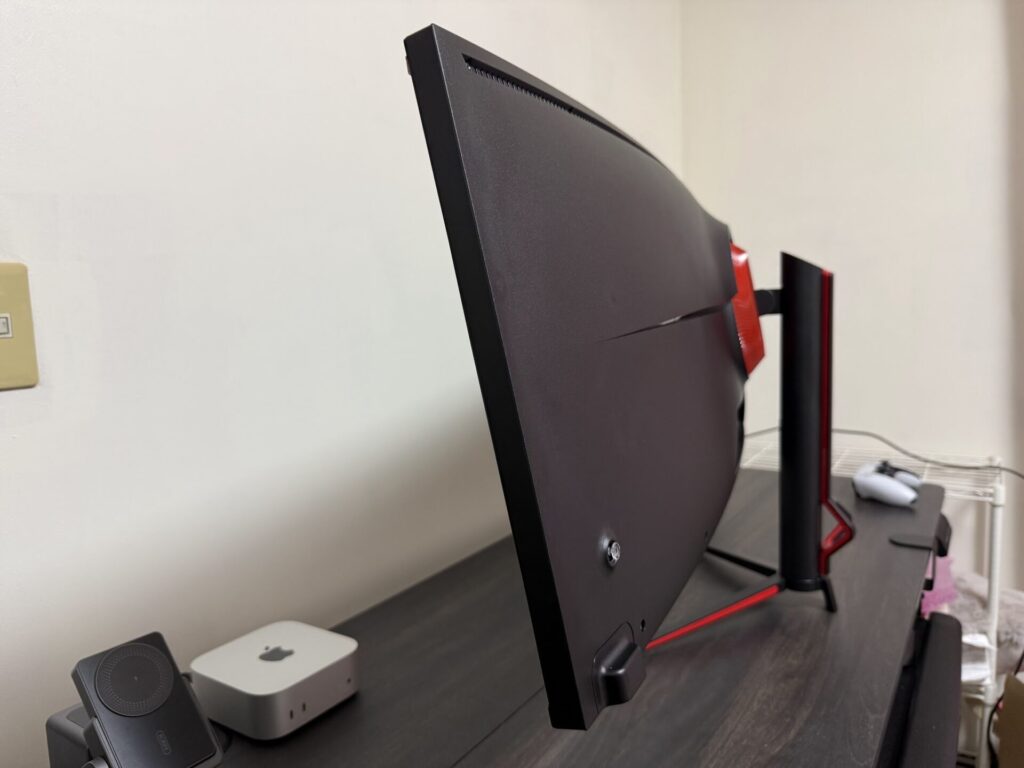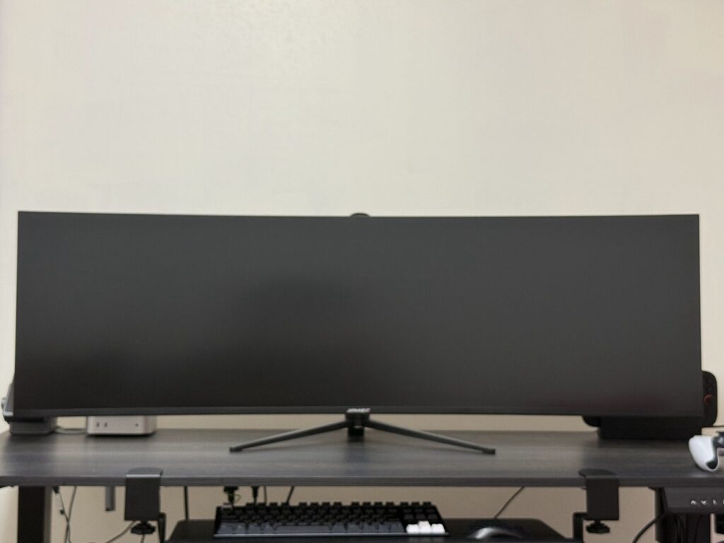 49インチという大きさは想像以上に大きく、横は121cm・縦はスタンド部分で25cmあるため、設置には十分なデスクスペースが必要です。