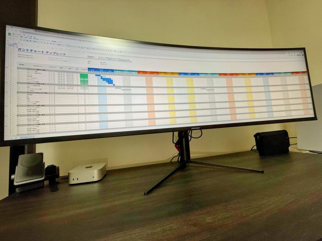 仕事では資料を見ながらコードを書いたり、複数のウィンドウを並べて作業したりと、マルチタスクが非常に快適になりました。WQHD(2560×1440)モニター2台分の作業スペースが1台で実現できるため、モニターアームやケーブルの本数も減ってデスク周りがスッキリします。