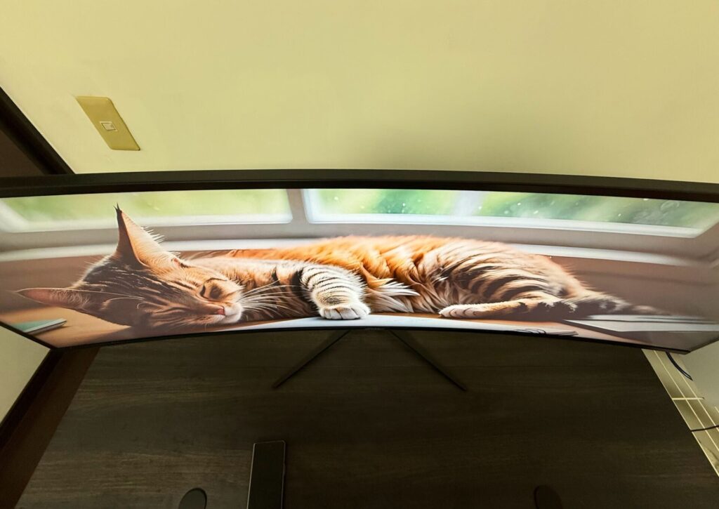 平面モニターと違い、画面の端まで視線を自然に追えるため、長時間の使用でも目や首が疲れにくいと感じました。