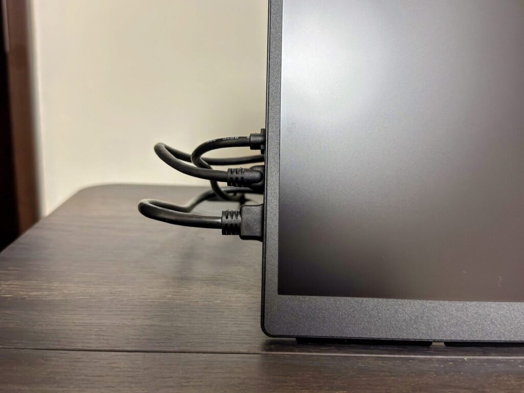ケーブルを繋ぐ位置がモニター側面にあるので、どうしても正面から見えてしまいます。