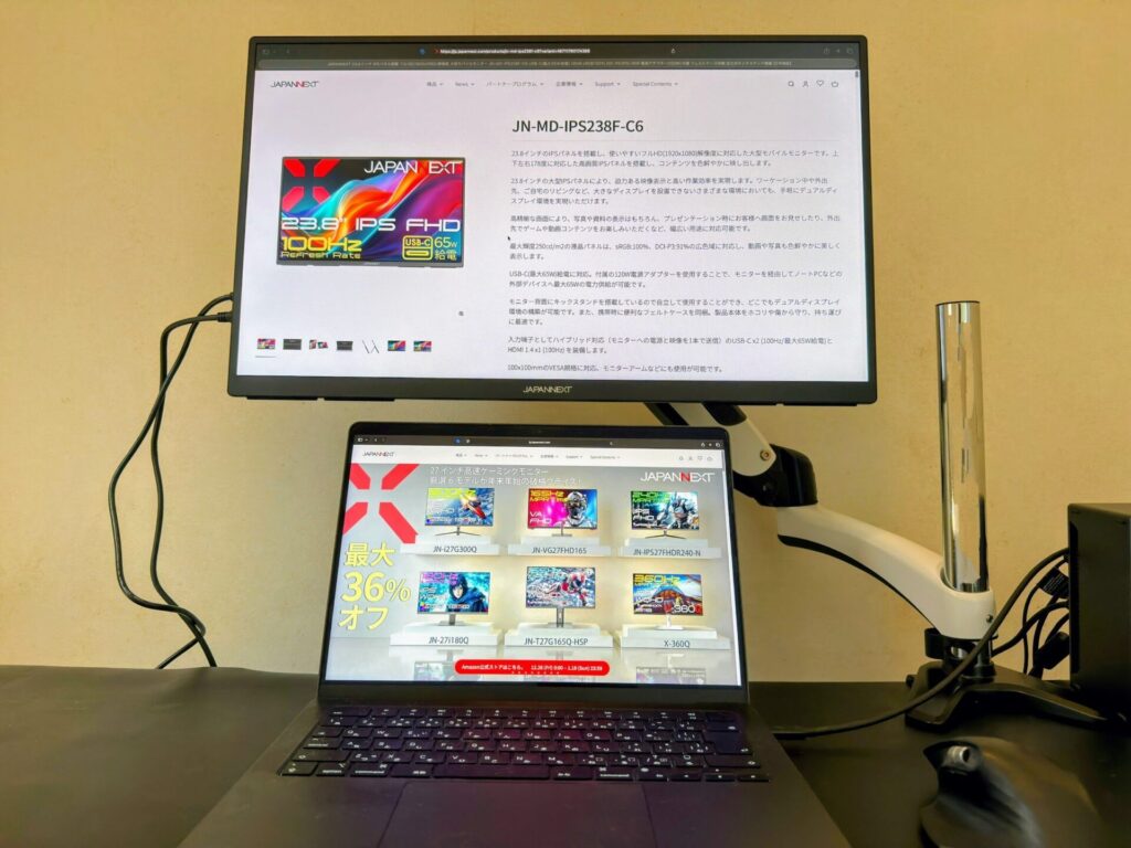 JAPANNEXTのモニターアーム「JN-ARM-GM112XDV」と併用してみました。