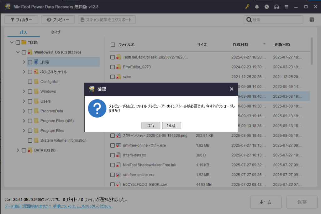 通常のゴミ箱機能では削除したファイルの内容を確認することはできませんが、MiniTool Power Data Recoveryでは復元前にプレビューできるのが特徴です。