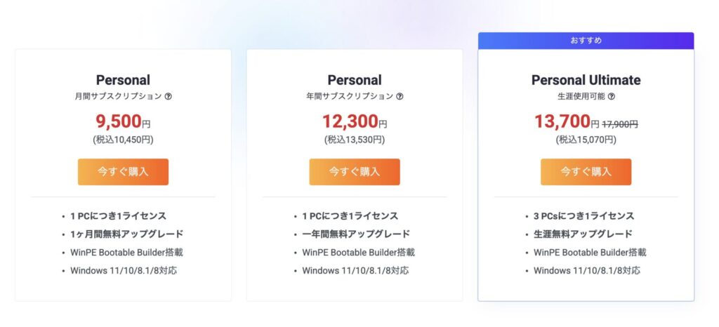 料金プランについてはPersonal(月間サブスク)、Personal(年間サブスク)、Personal Ultimate(買い切り)で3つ用意されています。