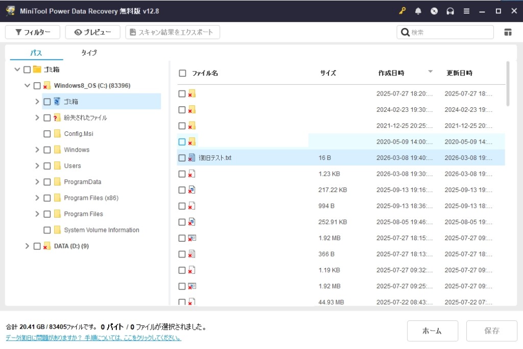 スキャンが行われ復元可能なファイルが一覧で表示されます。