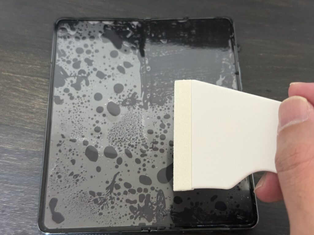 そのあとはWET貼付キット付属のスキージーを使って、フィルム内の水分や空気を押し出していきます。