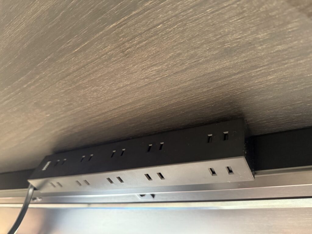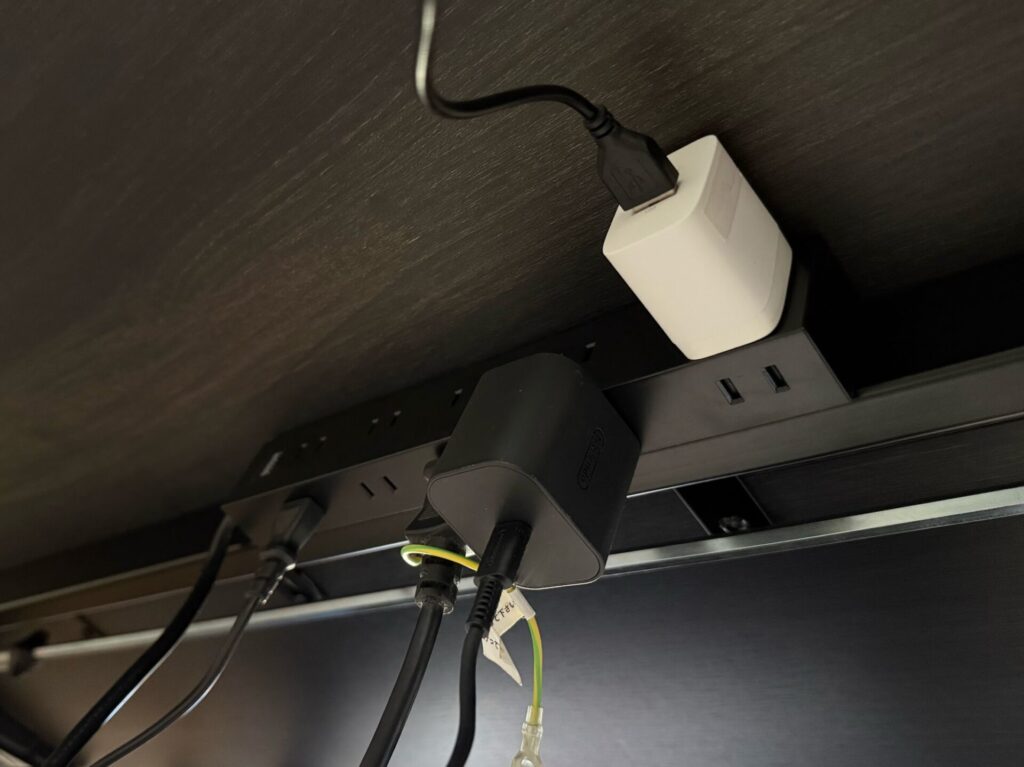ただ、デスク裏に設置しているので、USBポートがあっても使いにくいと思います。スマホの充電は充電スタンドや別途USB充電器をコンセントに挿して使っているので、特に困っていません。