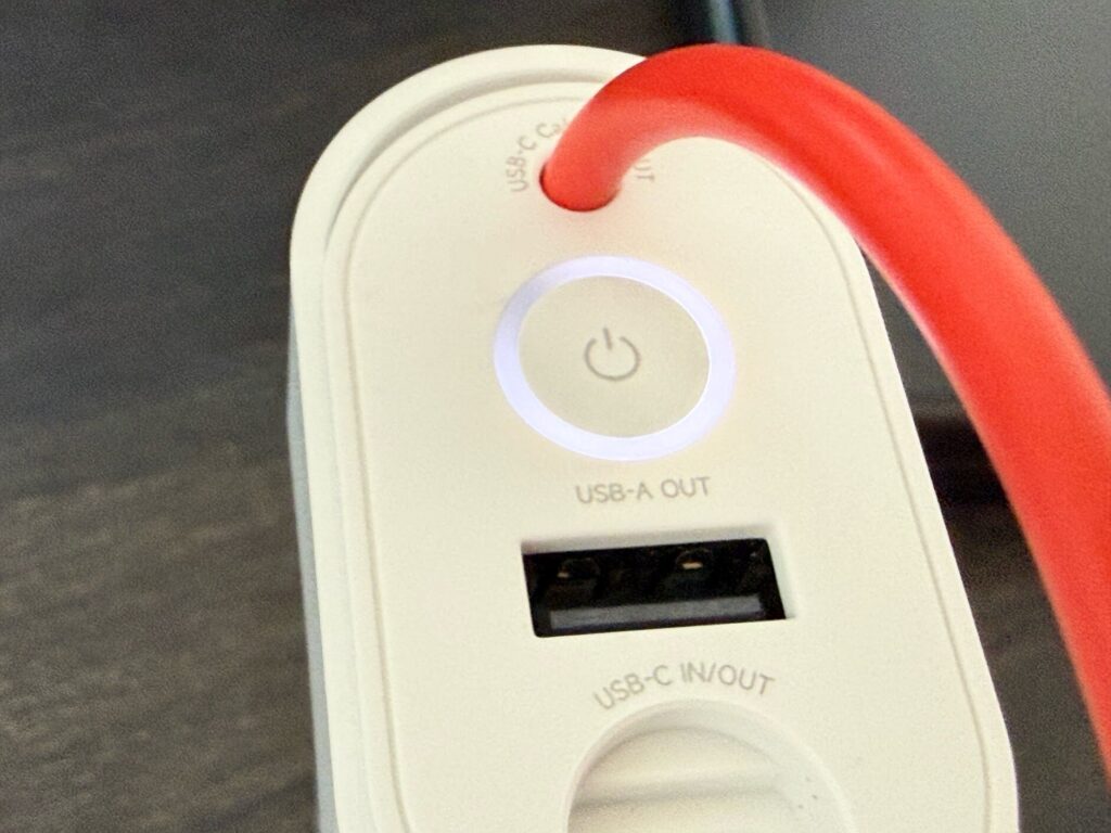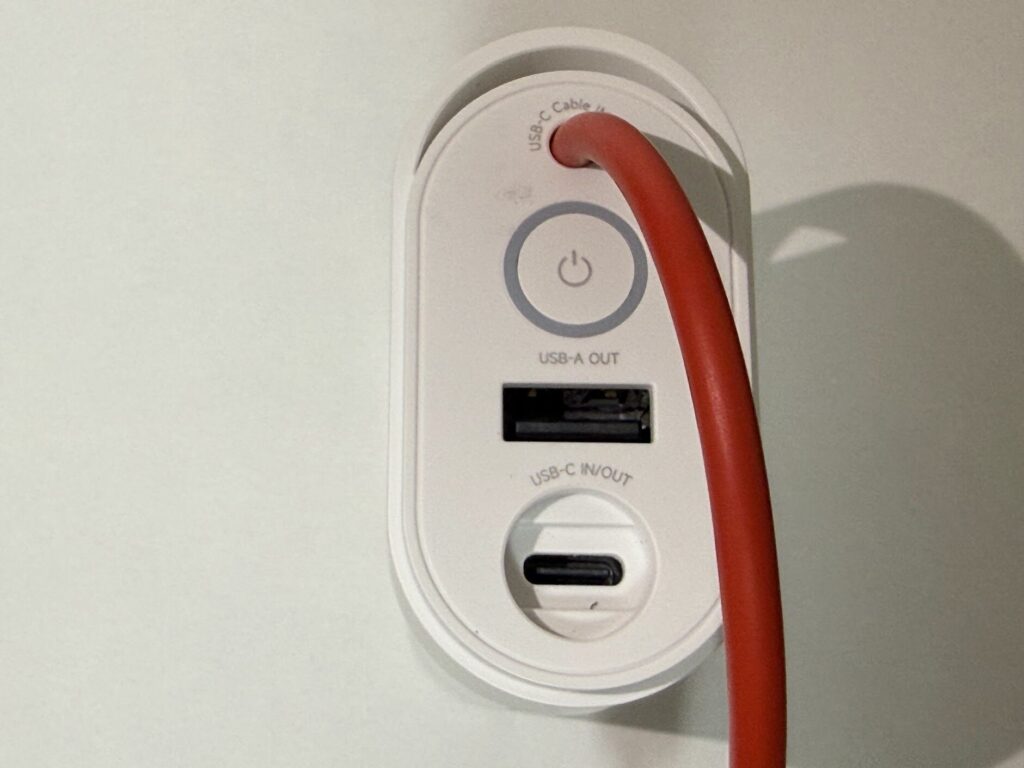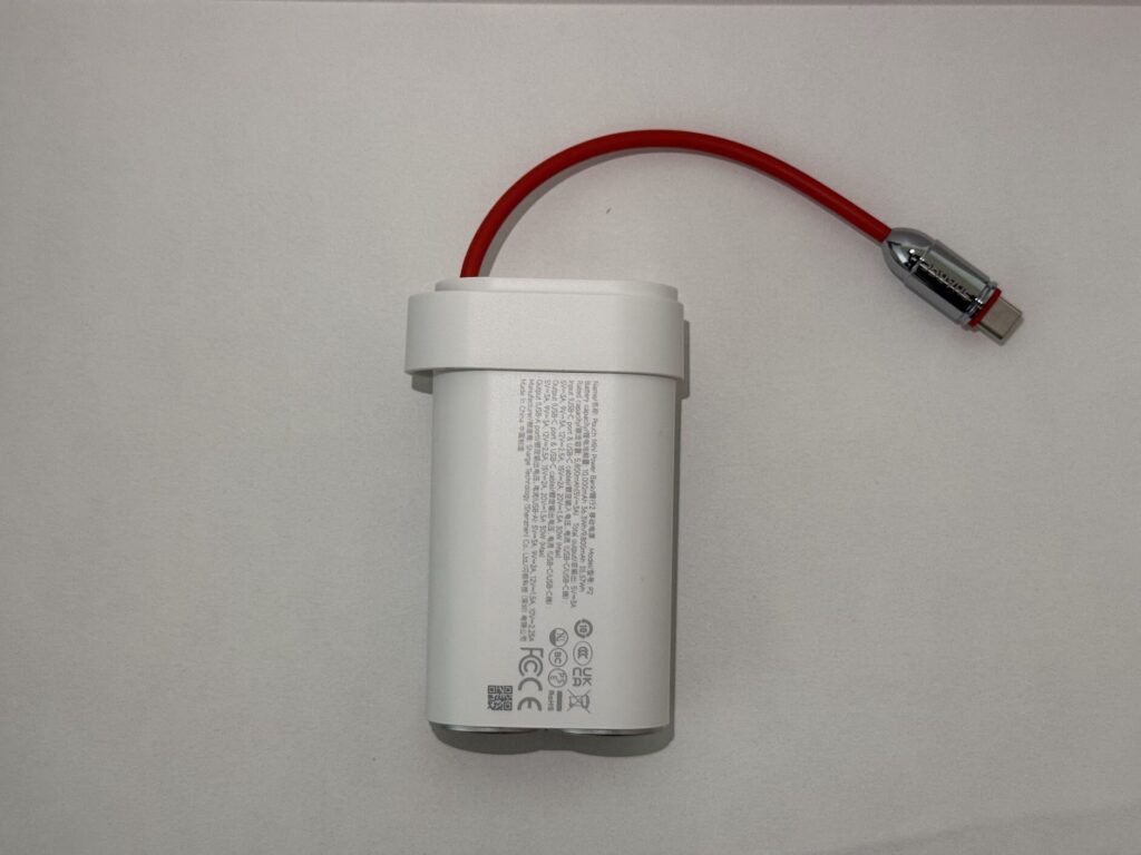 「Pouch Mini」の最大の特徴は、バッテリーセルをそのまま持ち歩いているような独特なデザインです。ホワイトを基調とした本体に、オレンジ色の内蔵USB-Cケーブルがアクセントになっており、他のモバイルバッテリーとは一味違う見た目となっています。