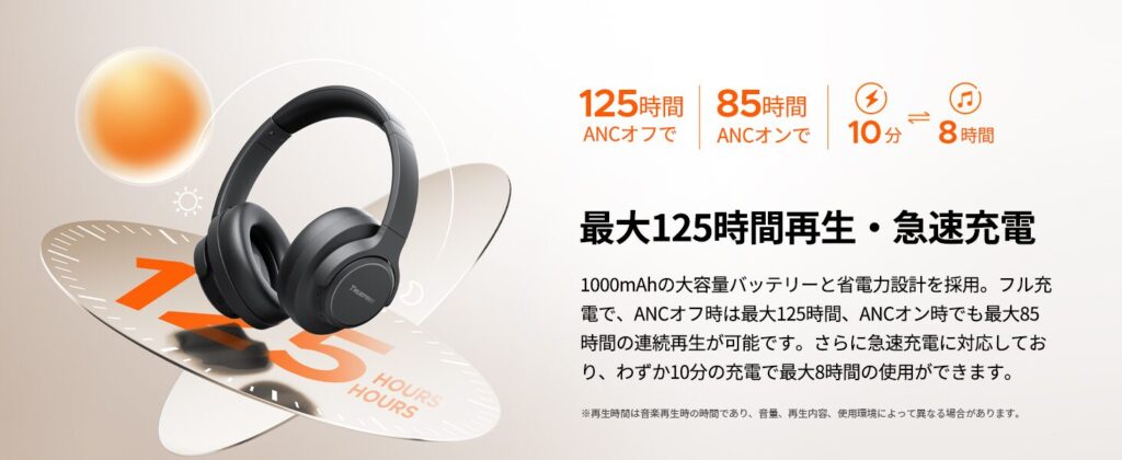 バッテリーは最大125時間(ノイズキャンセル有効時は85時間)の音楽再生が可能です。