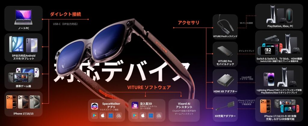 これは、SwitchやSwitch2をはじめとするHDMI機器を、VITUREのXRグラスに接続するための専用アダプターです。